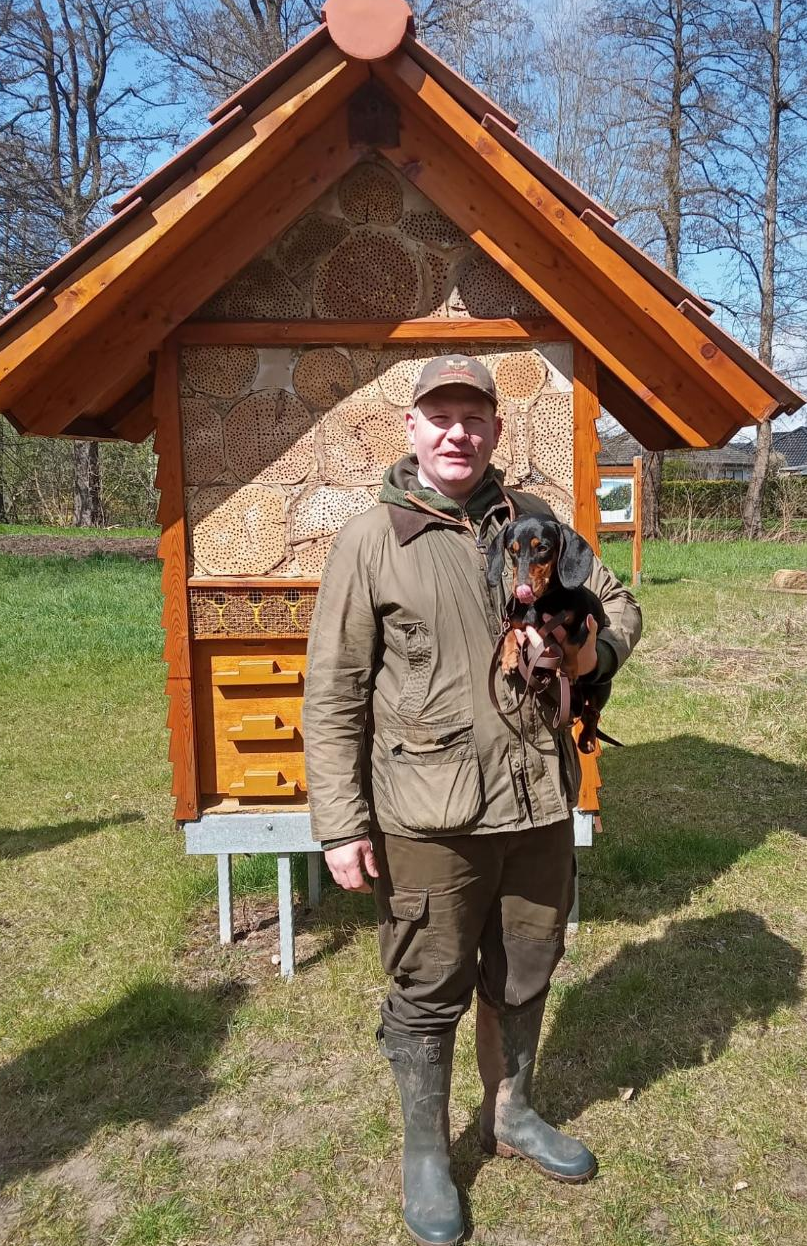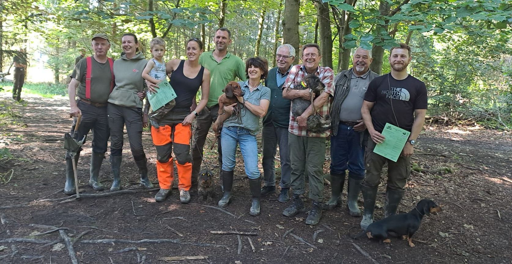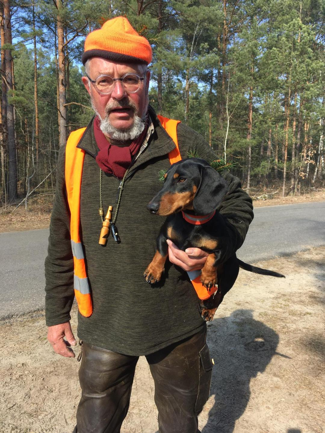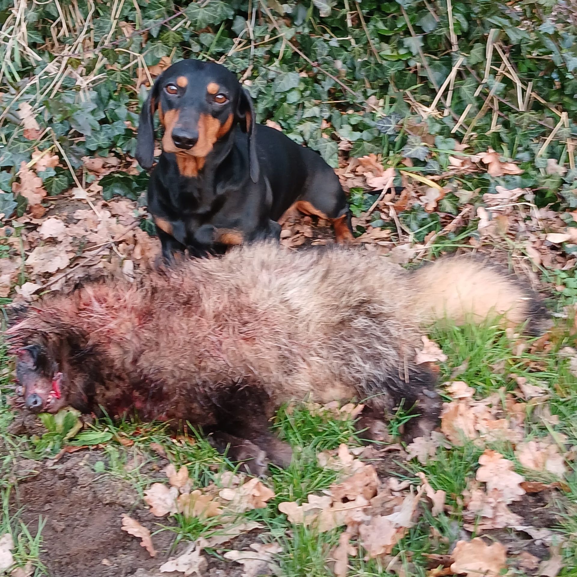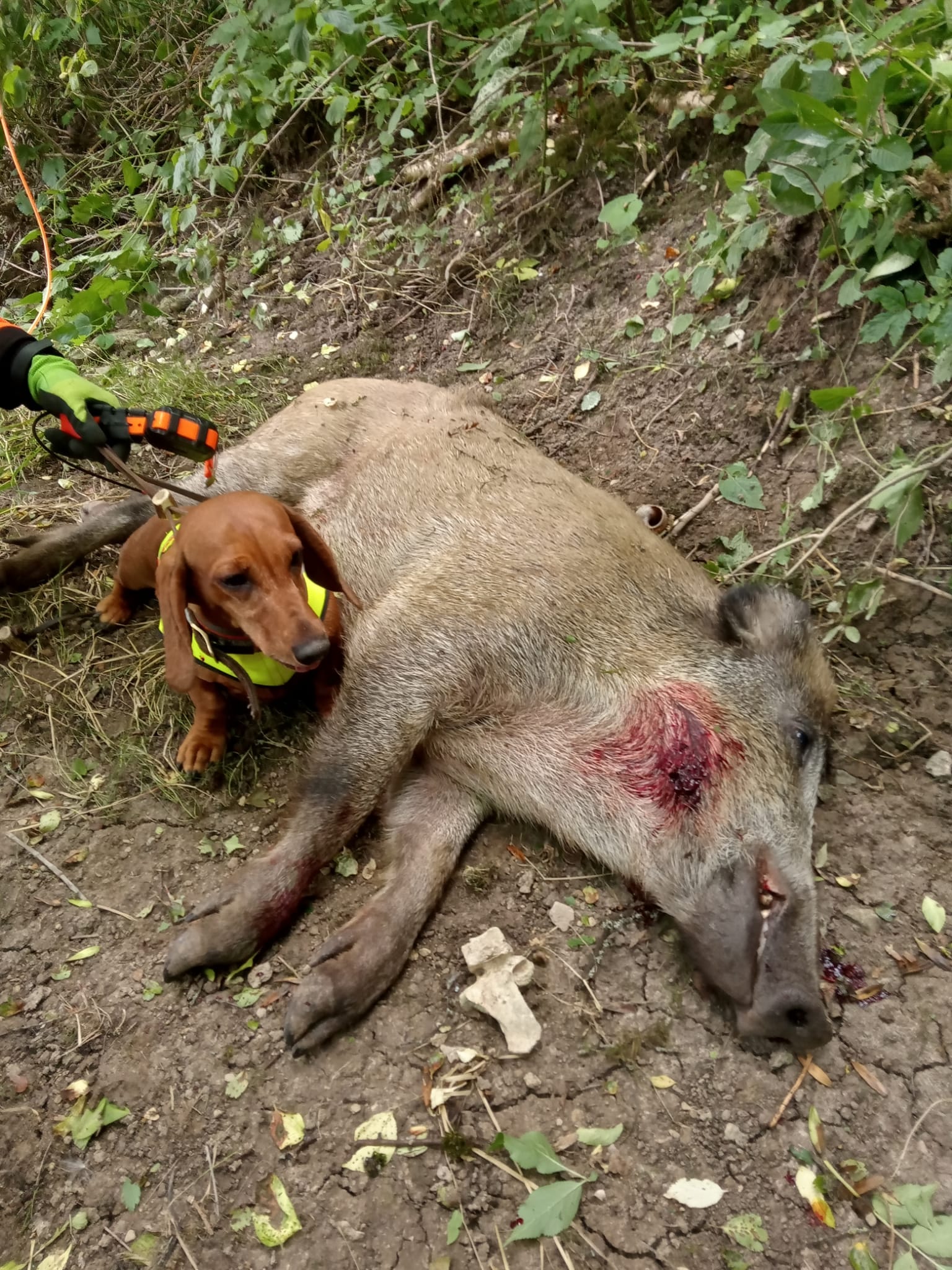 Am 04.05.2025 erhielten wir um 6.00 Uhr einen Anruf zur Nachsuche auf ein Stück Schwarzwild. Wir vereinbarten einen Treffpunkt mit dem Schützen und begannen um 7.30 Uhr mit der Suche. Dem Schützen war ein laufkrankes Stück Schwarzwild gekommen, dass er dann noch einmal beschossen hat und auch der Meinung war, es müsste nicht allzu weit liegen. Diese Vermutung bestätigte sich leider nicht. Wir verfolgten das Stück über eine Wiese und wechselten dann in den Wald. Dann kamen mehrere dichte Heckenkomplexe. Wir hatten jetzt schon ca. 3 km zurückgelegt. Nun kamen wir an einen Punkt, wo es nur noch möglich war den Hund zu schnallen, da hier für uns kein Durchkommen mehr war. Außerdem hatten wir sehr frischen Schweiß und somit war klar, dass Schwein zieht direkt vor uns. Es war jetzt schon 10.00 Uhr durch und wir entschieden uns eine Pause zu machen und unsere Hummel als Bei-Hund zu holen. Also Fee erklären, dass jetzt erstmal Schluss ist, was sie natürlich gar nicht verstehen konnte. Wir fuhren nach Hause, aktivierten noch ein par Schützen zum abstellen des Heckenkomplexes und hofften, dass sich Fee etwas ausruht (dachten wir aber nur). Um 12.30 Uhr fuhren wir dann mit Fee und Hummel im Gepäck an die Stelle, wo wir die Suche abgebrochen hatten. Beide Damen wurden mit Signalhalsbändern und Sendern bestückt und Fee wurde geschnallt. Sie nahm die Fährte sofort wieder an. Nach 60 Metern war auch schon ihr Laut zuhören und wir schnallten sofort Hummel, die ihrer Mutter gleich zu Hilfe eilte. Nun fielen zwei Schüsse, welche das Schwein aber leider nicht tödlich trafen und hörten die Teckel mit Laut auf uns zukommen. Ca. 20 Meter über uns konnten sie die schwer kranke Sau in den Hecken stellen, so das Heiko einen sauberen Fangschuss anbringen konnte und das Tier von seinen Leiden erlösen. Vor uns lag ein ca. 60 Kg schwerer Keiler. Nach dieser Leistung wissen wir wieder warum wir Teckel haben. Es ist einfach Wahnsinn so etwas mitzuerleben. Unsere Fee ist nun schon 10 Jahre und vollbringt immer noch solche Leistungen. Einfach Klasse!!!