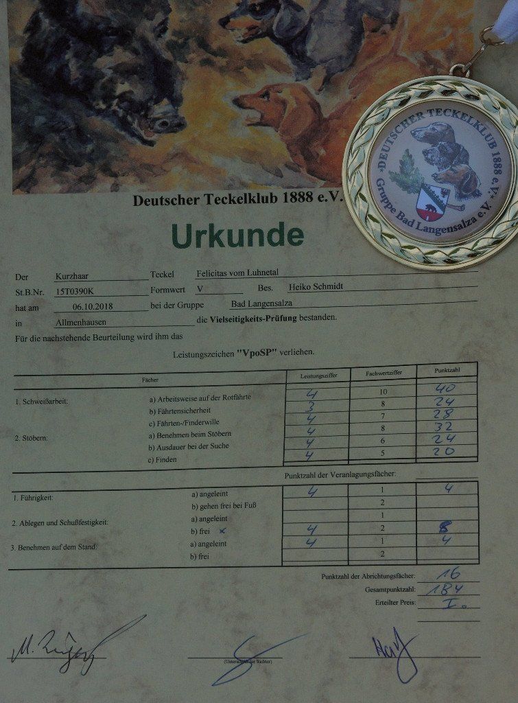 Am 22.10.2022 absolvierte Frau Kerstin Schreiber mit Igor vom Luhnetal die Vielseitigkeitsprüfung bei der Gruppe Kiel 1 e.V. mit einer Gesamtpunktzahl von 276 Punkten im 1. Preis. Igor erhielt in allen Fächern die höchste Leistungsziffer 4. Außerdem wurde er Tagessieger. Wir gratulieren Frau Schreiber recht herzlich zu dieser tollen Leistung. Igor wird auch als Deckrüde zur Verfügung stehen und die Teckelzucht bereichern.