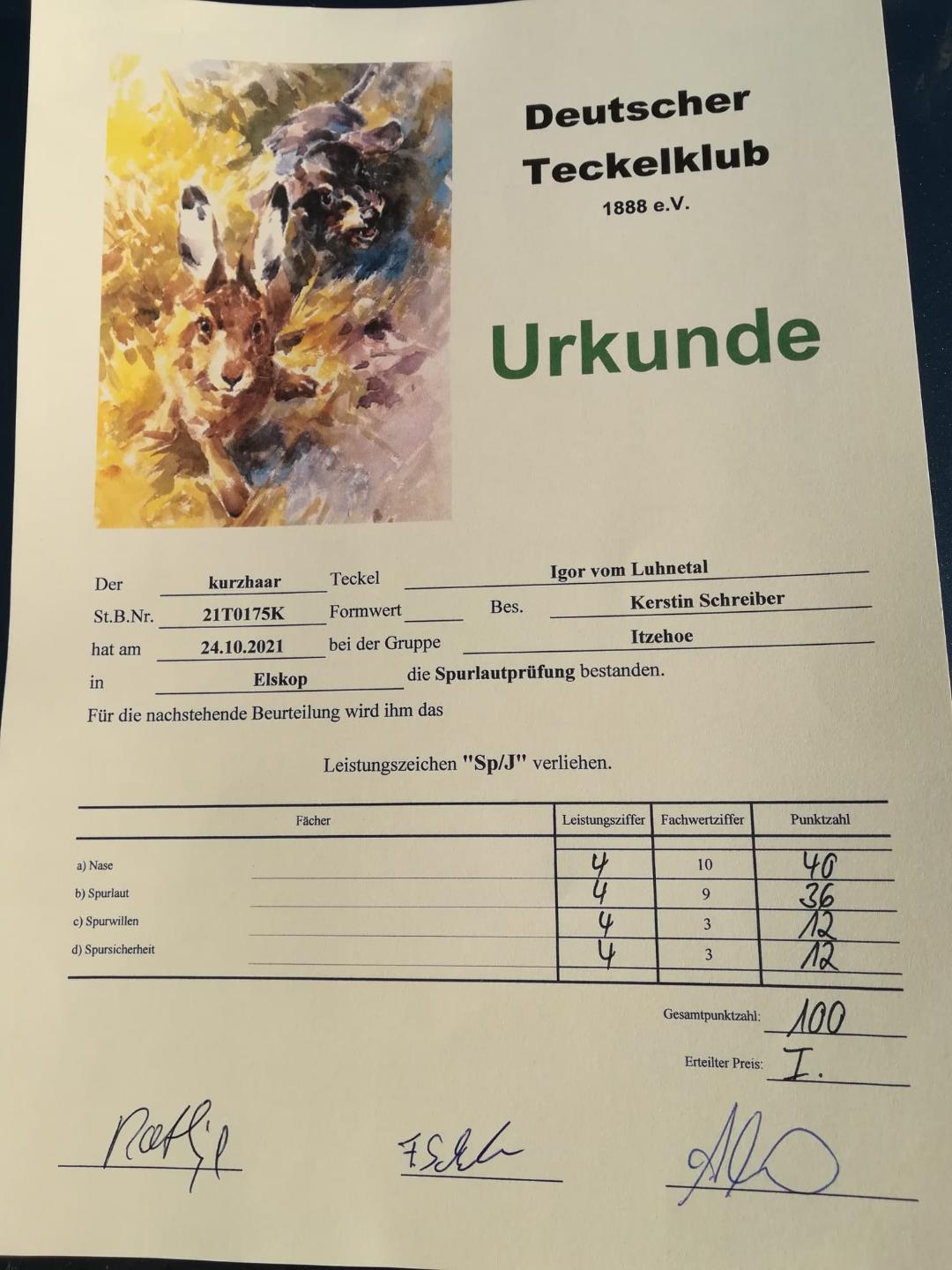 Am 24.10.21 hat Frau Kerstin Schreiber mit Igor vom Luhnetal die Spurlautprüfung mit 100 Punkten im 1. Preis bestanden. Igor arbeitete die Hasenspur fast 500 m auf verschiedenen Böden. Da Igor erst 7 Monate ist wurde ihm somit das Leistungszeichen Sp/J verliehen. Außerdem wurde er bei dieser Prüfung Tagessieger.